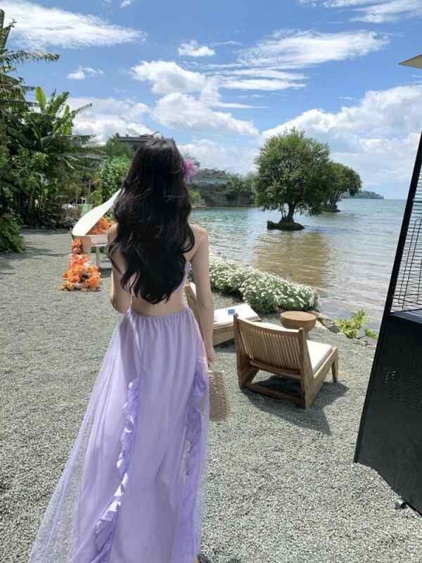 ワンピース レディース リゾート風 デザイン パープル チュール ネット Aライン ロングワンピース 高見え ノースリーブ ギャザー ドレープ フェミニン エレガント お洒落 上品 高見え デート 旅行