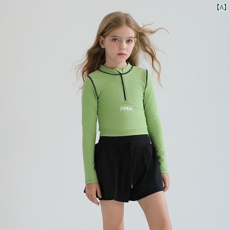 水着 キッズ 女の子 ガールズ セパレート 長袖 UVカット 紫外線対策 日焼け防止 スカート付き プール 温泉 水遊び スイムウェア セット ジュニア ポリエステル ナイロン スパンデックス ストレッチ グリーン