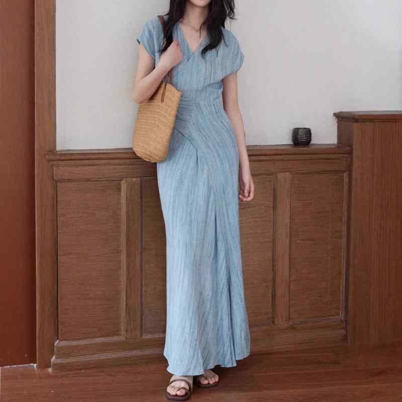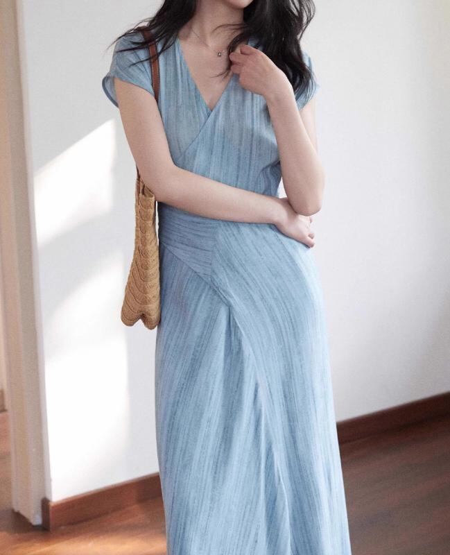 ワンピース レディース Vネック 半袖 シワ加工 通勤 オフィス カジュアル ミディ丈 Aライン ハイウエスト シンプル きれいめ 上品 エレガント ポリエステル 春夏 ブルー 青