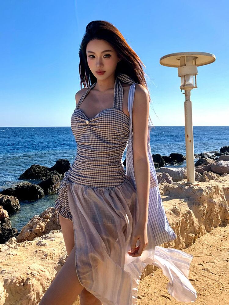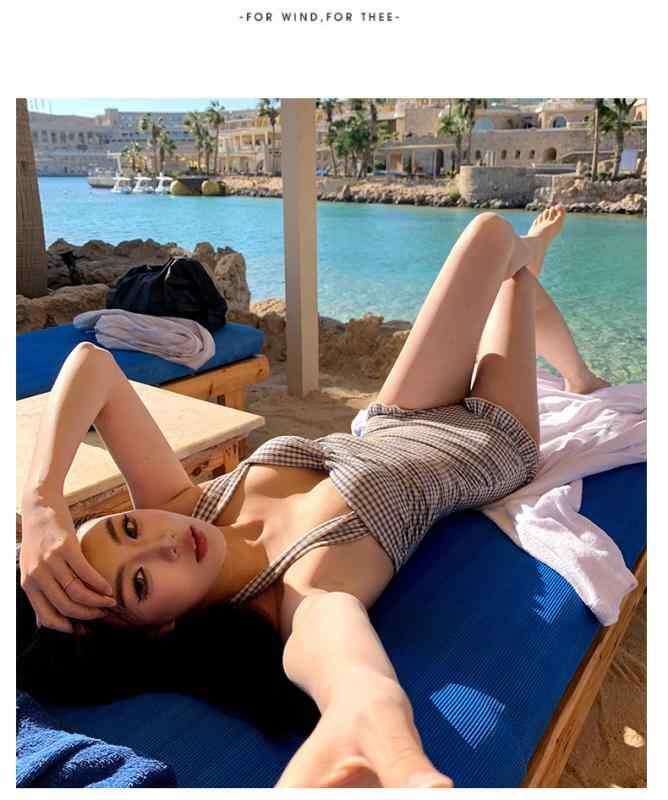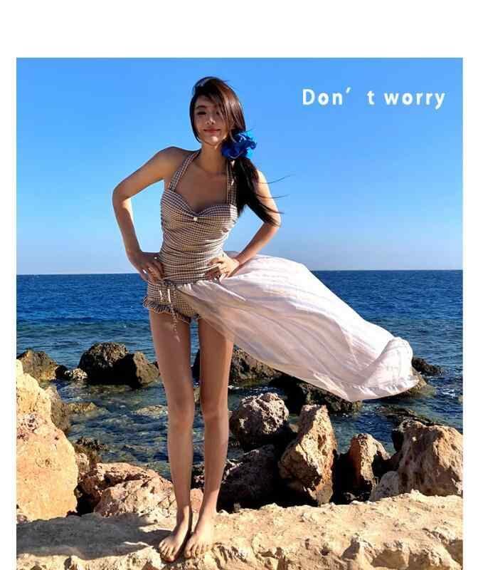 ワンピース水着 レディース 高級感 体型カバー 着痩せ効果 プール ビーチ 温泉 リゾート ワイヤー入りパッドなし チェック柄 ポリエステル素材 ノースリーブ