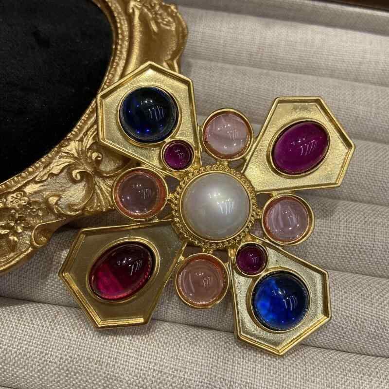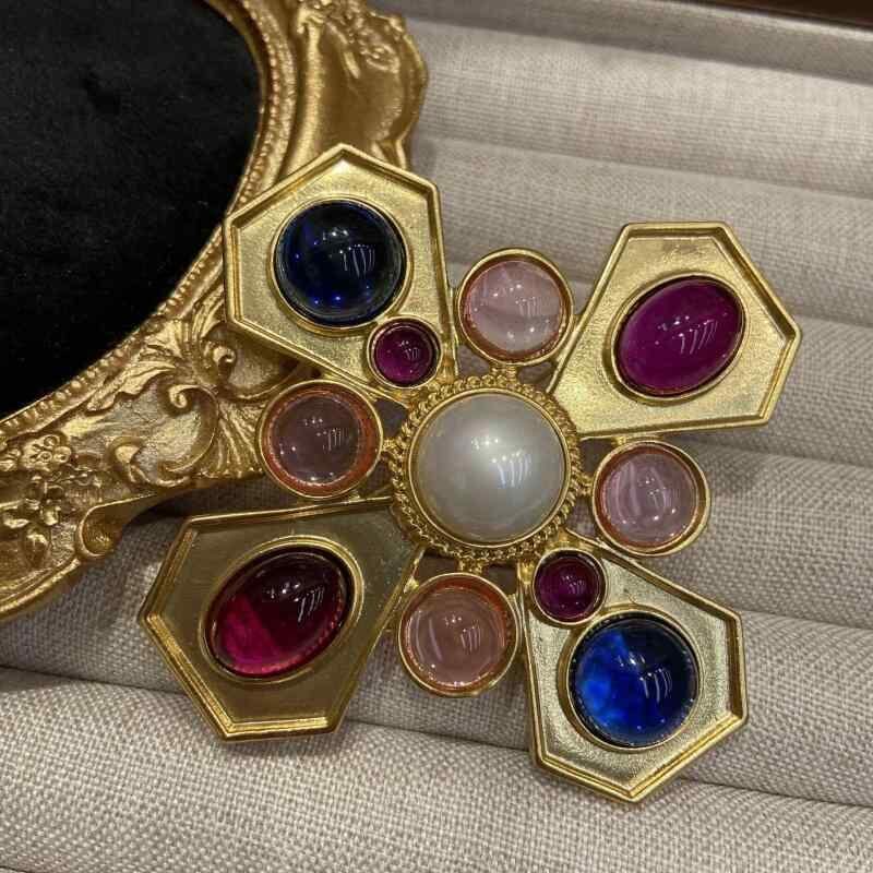 ブローチ レディース ヴィンテージ 中古風 西洋アンティーク 復刻 本金メッキ カラーストーン クロス 銅製 電気メッキ加工 記念日 飾り 多機能 結婚式 ギフト 秋冬