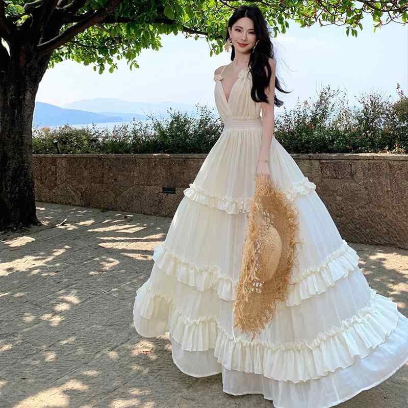 ワンピース レディース ノースリーブ 吊りスカート ケーキスカート 高見え ポリエステル 杏色 エレガント リゾート 体系カバー おしゃれ きれいめ 上品 デート
