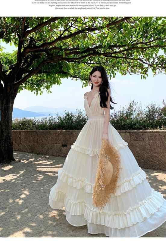 商品仕様: ・素材: ポリエステル ・柄: 無地 ・スタイル: キャミソールワンピース ・スカート丈: ミモレ丈 ・スカートタイプ: ケーキスカート ・ネックライン: ホルターネック ・袖丈: ノースリーブ ・ウエスト: ハイウエスト ・カラー: アプリコット ・サイズ: S、M、L ・テイスト: リゾート、エレガント