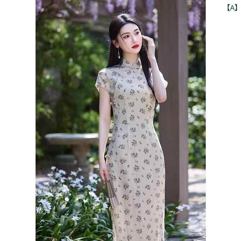 チャイナドレス レディース 春夏 半袖 ロング丈 レトロ ヴィンテージ 改良 普段使い スタンドカラー スリット ポリエステル 人工綿 麻 若者向け ワンピース
