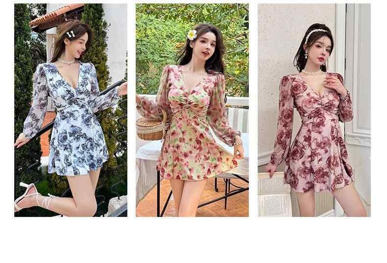 水着 レディース ワンピース型 長袖 花柄 スカート フレア 体型カバー 細見え 大きいサイズ ゆったり コンサバティブ 高弾性 速乾 ナイロン スパンデックス 春夏
