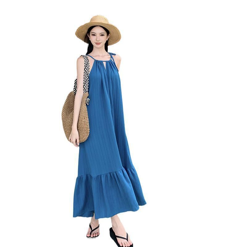 ワンピース レディース 夏 リゾート ロング丈 キャミソール 冷感 無地 TR素材 ビーチ 海 旅行 ドバミン かわいい 中国風 ブルー S M L XL