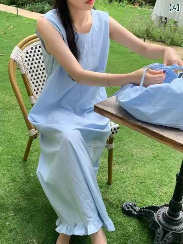 商品仕様: ・柄: 無地 ・スタイル: カジュアル ・袖丈: ノースリーブ ・ネックライン: ラウンドネック ・スカート丈: ミモレ丈 ・スカートタイプ: Aライン ・素材: その他 ・カラー: ブルー、イエロー、ホワイト、レッドパープル ・サイズ: フリーサイズ ・ウエスト: ハイウエスト
