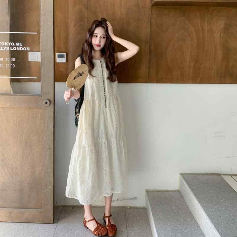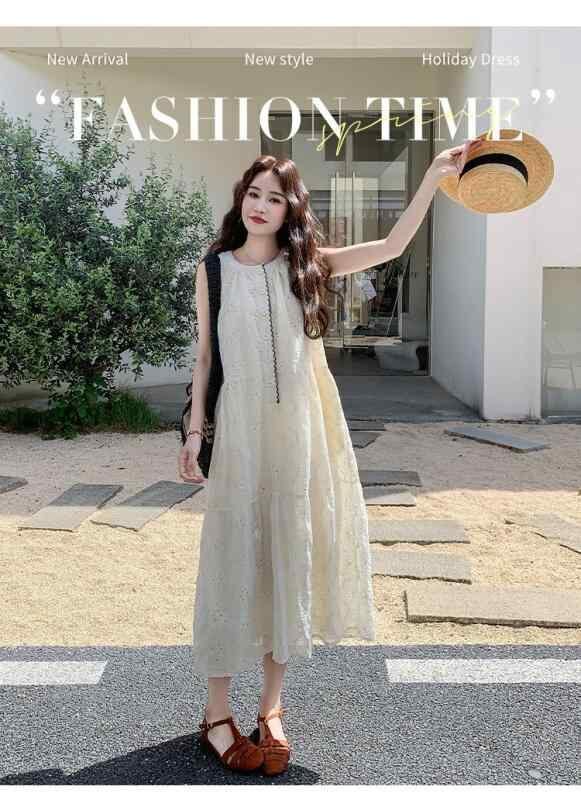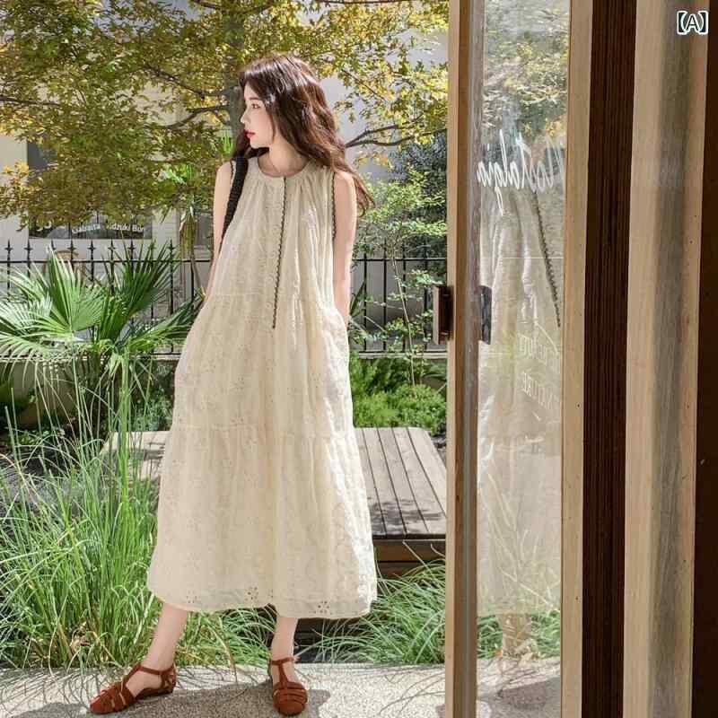 ワンピース レディース フレンチ 大人可愛い レース 刺繍 ノースリーブ Aライン ロング丈 ハイウエスト ラウンドネック 切り替え ポリエステル 無地 ベージュ 夏