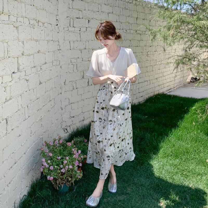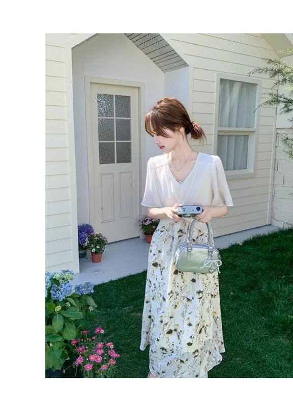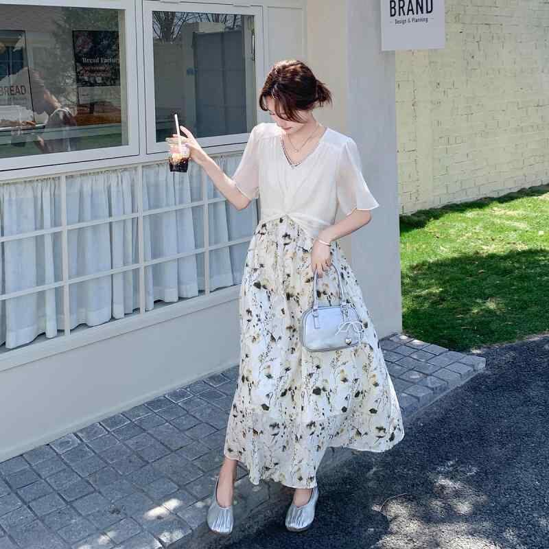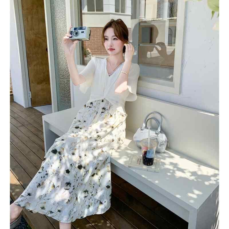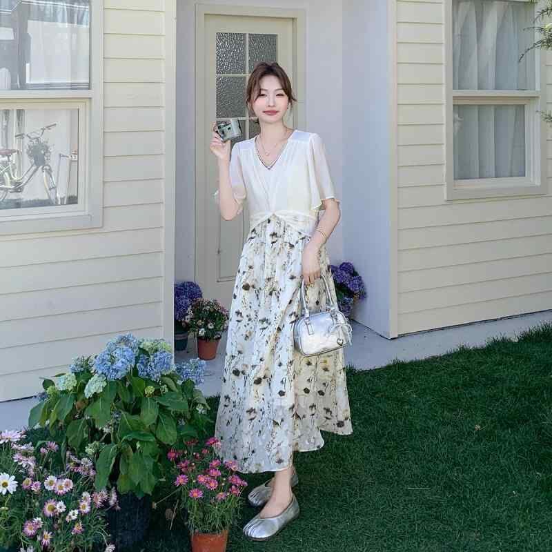 ワンピース レディース 小花柄 フレンチ 切り替え フェイクツーピース ロング 高級感 カジュアル 普段使い Vネック 半袖 ハイウエスト Aライン ポケット付き 春夏 ポリエステル フェミニン ナチュラル
