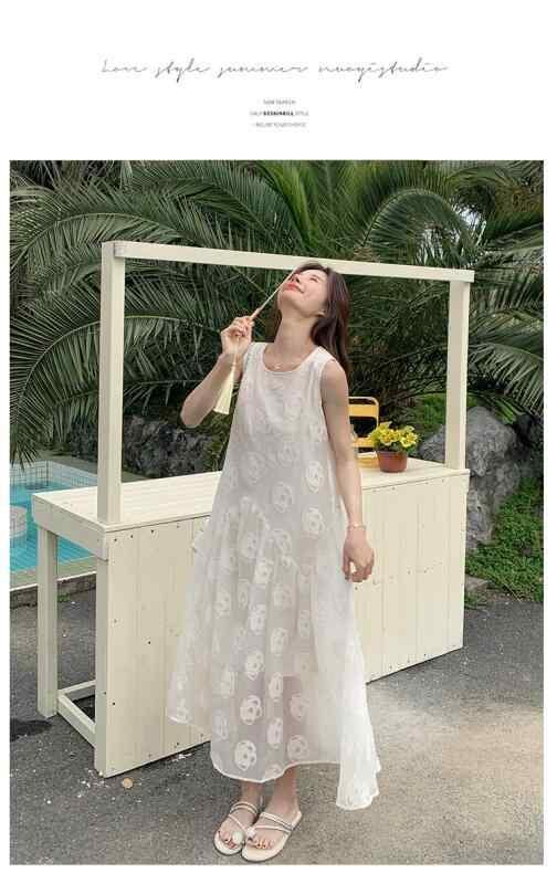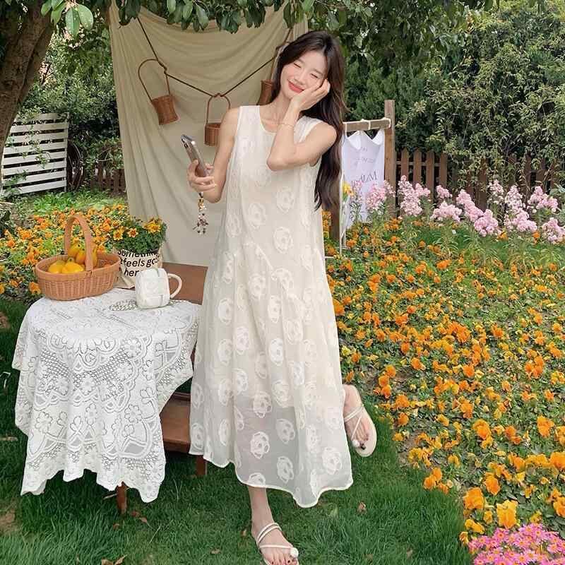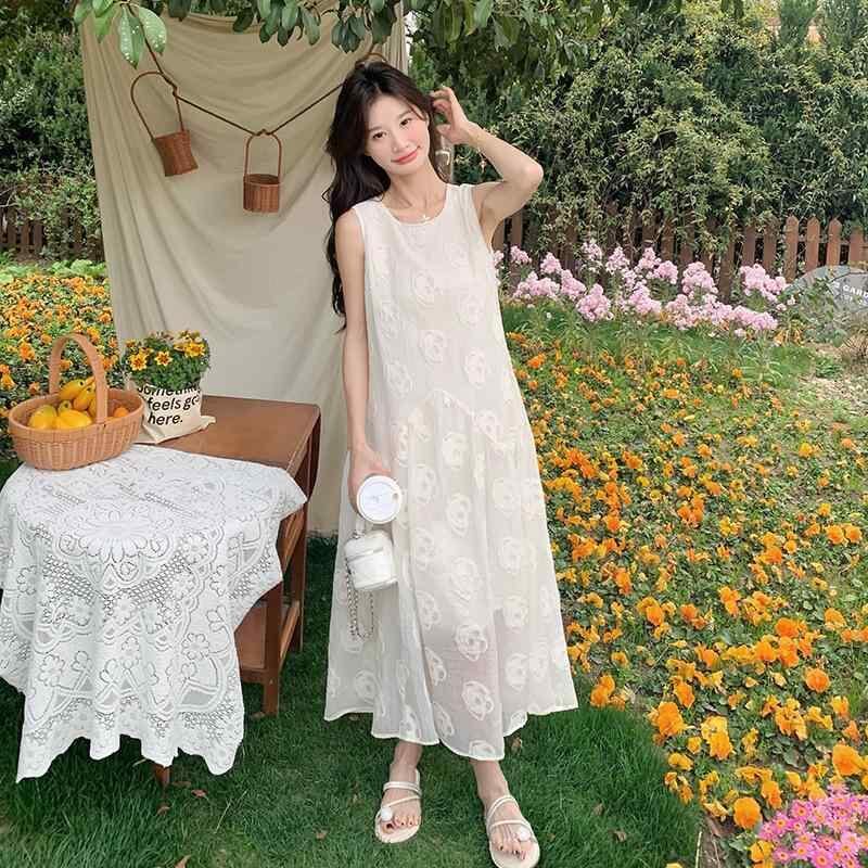 ワンピース レディース 韓国風 フェミニン ラウンドネック ノースリーブ ロング丈 スウィート エレガント 若見え 無地 ゆったり ポリエステル 白 夏