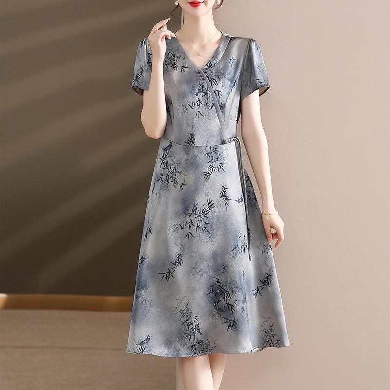 ワンピース レディース ミセス 新チャイナ風 シフォン なめらか シルク調 Vネック 半袖 Aライン 小花柄 リゾート ビーチ バカンス 体型カバー ポリエステル ブルー グリーン 春夏