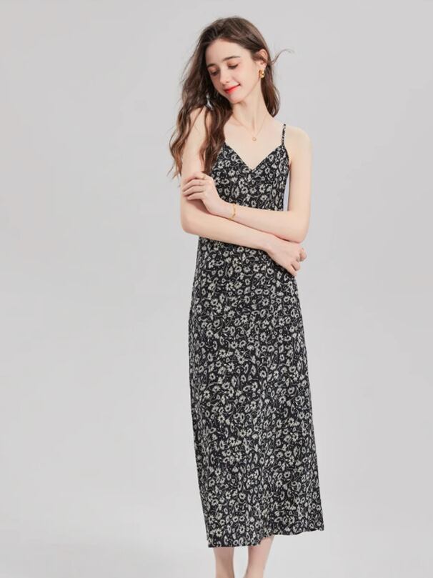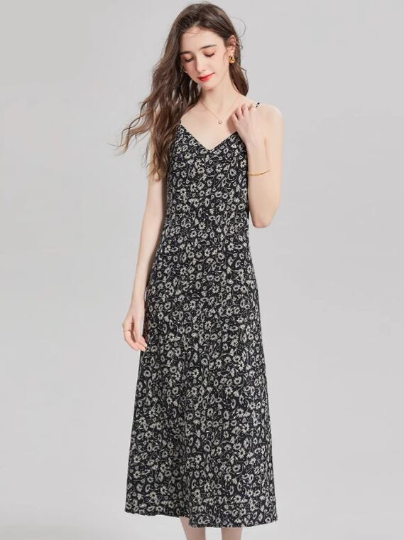 ワンピース レディース 桑蚕シルク エレガント リゾート 夏 ビーチドレス 小花柄 キャミソール ロング丈 Vネック ノースリーブ ブラック プリーツ ゆったりシルエット 通勤 カジュアル