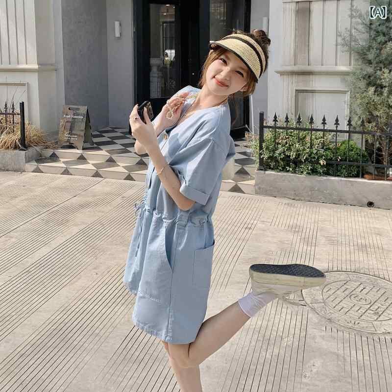 シャツワンピース レディース 半袖 青 ライトブルー オフホワイト ロング丈 Vネック Aライン ハイウエスト 小柄 低身長向け フェミニン フレンチスタイル 春夏 上品 ポリエステル ポケット付き 通勤 カジュアル 普段使い