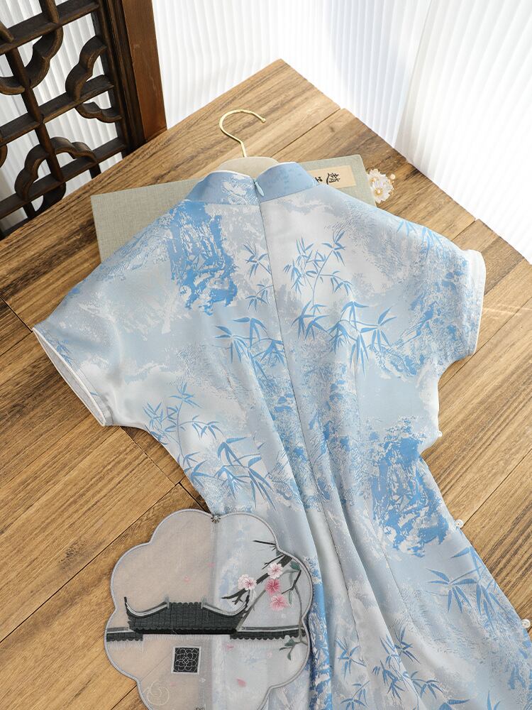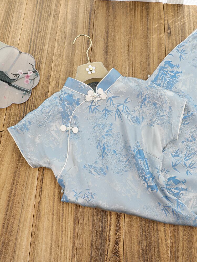 チャイナドレス レディース 女性用 青色 改良 新中華風 半袖 上品 エレガント ポリエステル ワンピース ドレス 普段使い 春夏
