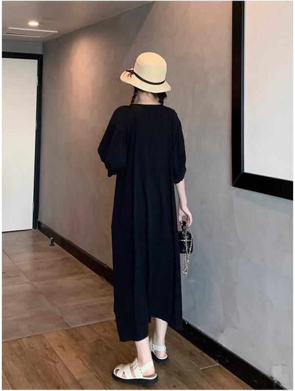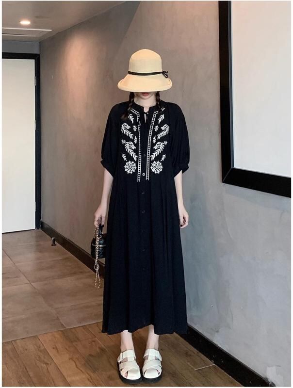 商品仕様: ・カテゴリ: ワンピース ・スタイル: 通勤 ・素材: 綿 ・袖丈: 半袖 ・ネックライン: ラウンドネック ・スカート丈: ロング ・スカートタイプ: Aライン ・カラー: ブラック ・サイズ展開: XL、2XL、3XL、4XL ・デザイン: 刺繍