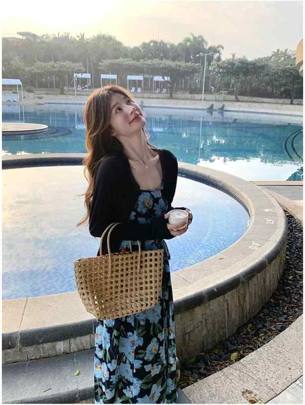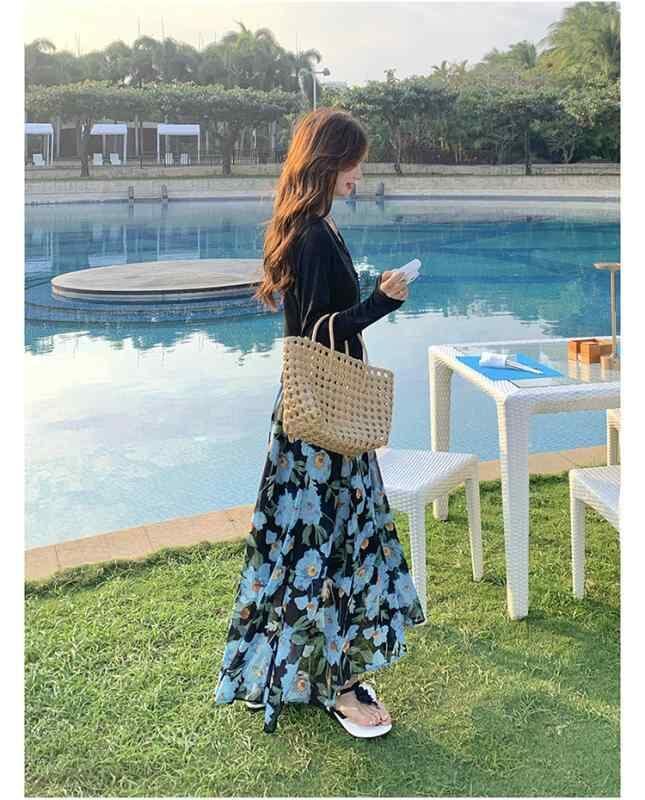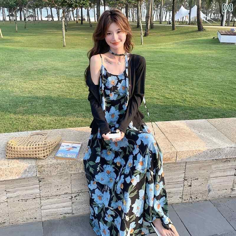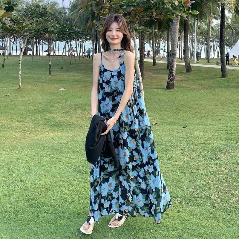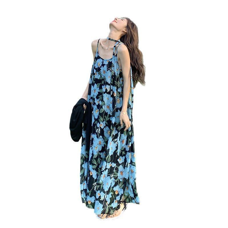 ワンピース レディース フレンチスタイル リゾート ビーチ ロング丈 マキシ丈 キャミソール ノースリーブ Aライン ハイウエスト 上品な質感 花柄 ブループリント ポリエステル素材 春夏 フェミニン ナチュラル バカンス