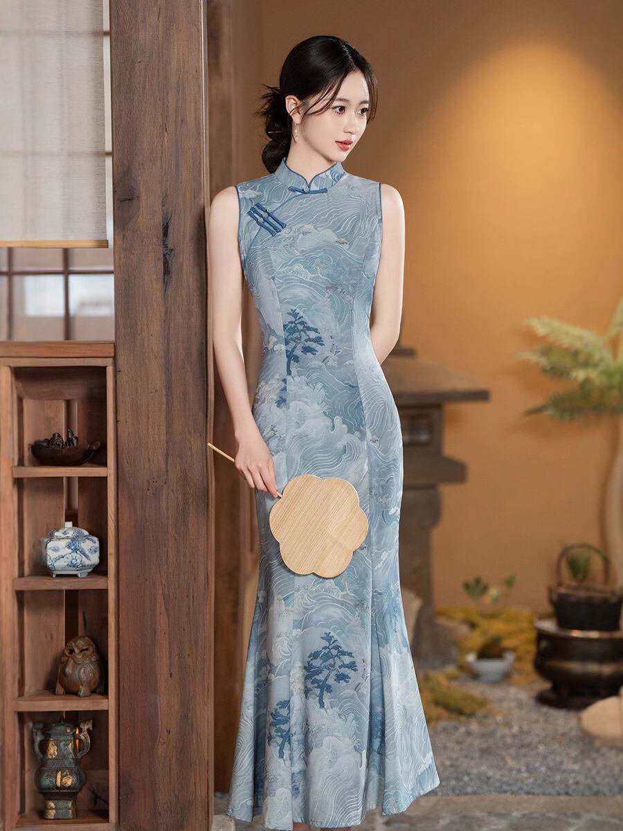 チャイナドレス レディース 中国風 春夏 ポリエステルサテン ロング丈 スタンドカラー レトロ 改良型 スリムフィット 着痩せ マーメイドライン ハイウエストスリット