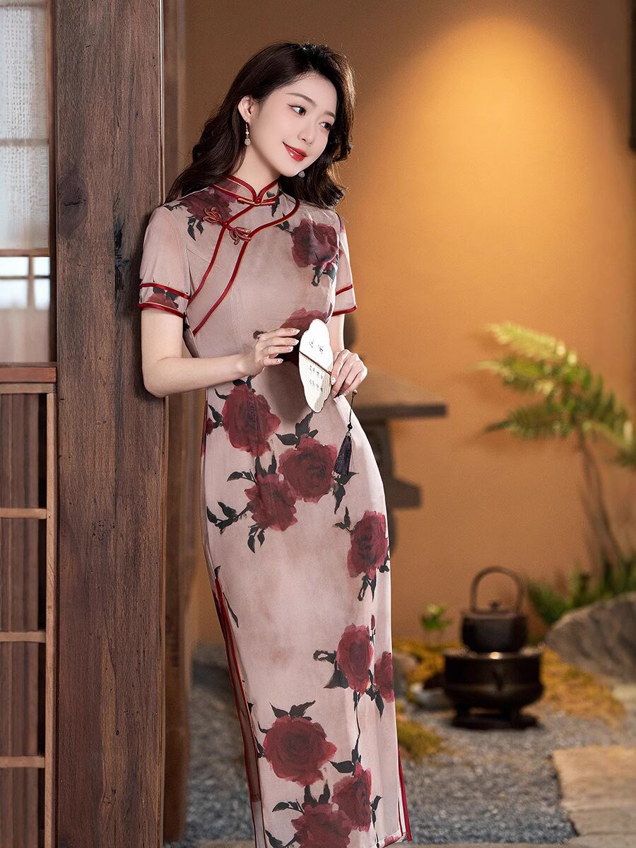 チャイナドレス レディース 春夏 改良型 ロング丈 スイスメッシュ 上品 レトロ 二重仕立て デイリーユース