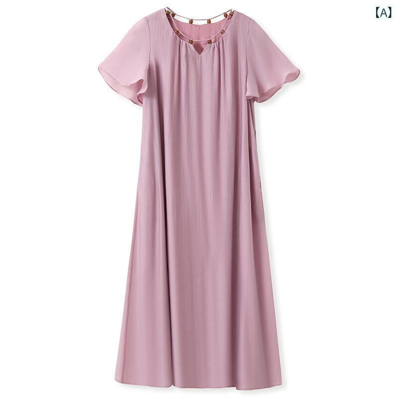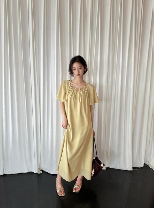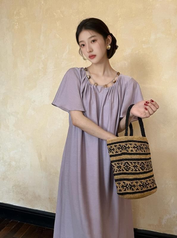ワンピース レディース 春夏 ファッション 韓国風 上品 テンセル リヨセル繊維 ロング丈 フレンチ シンプル 細見え フェミニン フリル袖 五分袖 Aライン ラウンドネック 無地 切り替え ライラック クリームイエロー