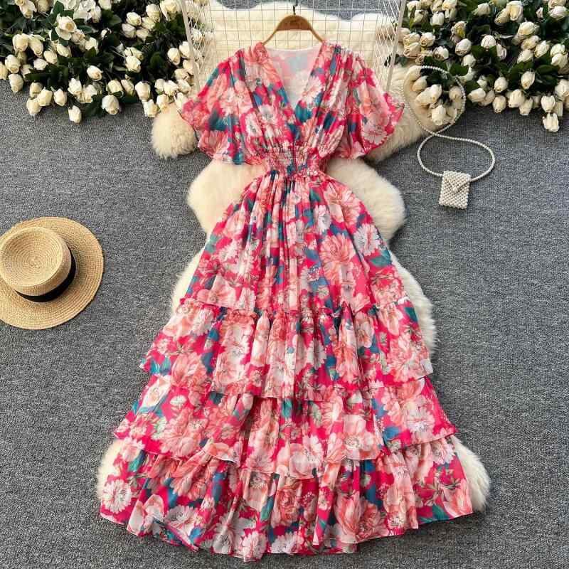 ワンピース レディース Vネック 半袖 花柄 チュニック Aライン フレアスカート ロング丈 シフォン ギャザー 高見え ウエストマーク 薄手 イエロー ブラック ブルー オレンジ レッド ホワイト パープル