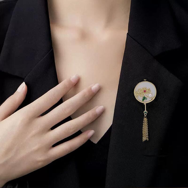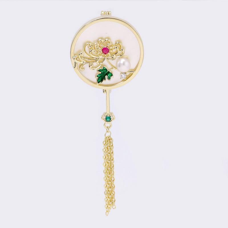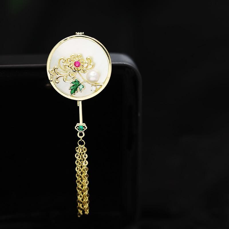 ブローチ レディース 女性用 天然マザーオブパール 蘭 オーキッド チャイナ風 扇モチーフ タッセル スーツ ジャケットピン チャイナドレス 襟元飾り 2WAY キュービックジルコニア エレガント レトロ クラシック
