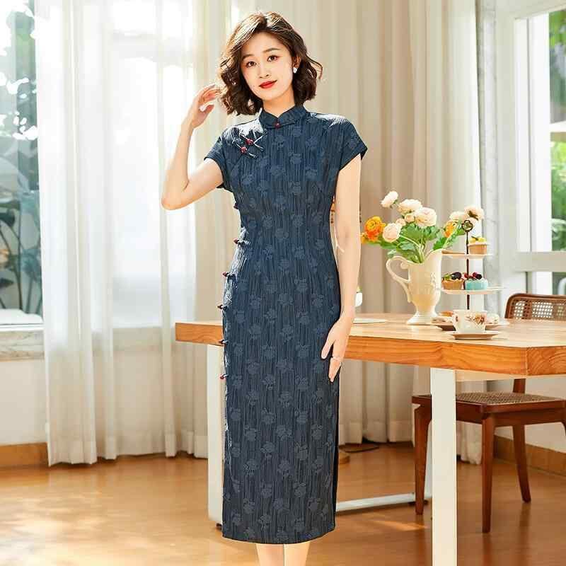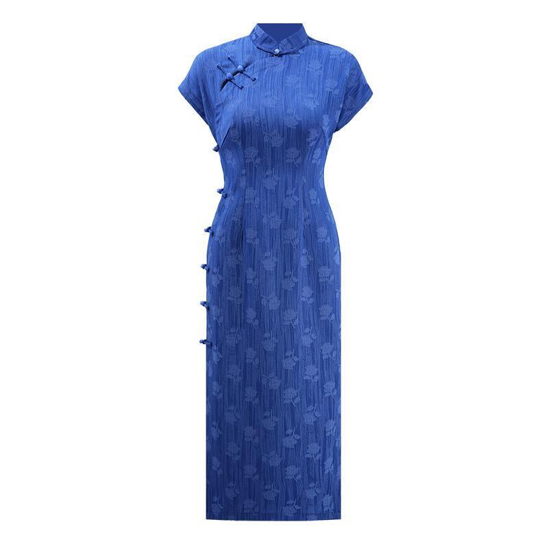 チャイナドレス レディース 春夏 レトロ 改良 中国風 普段使い デイリーユース ロング丈 3分袖 スタンドカラー ポリエステル レトロネイビー レッド