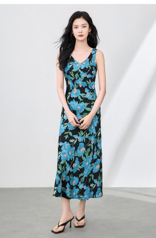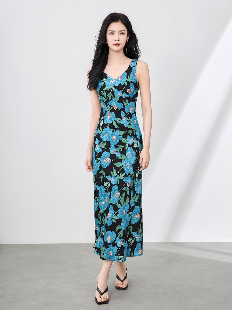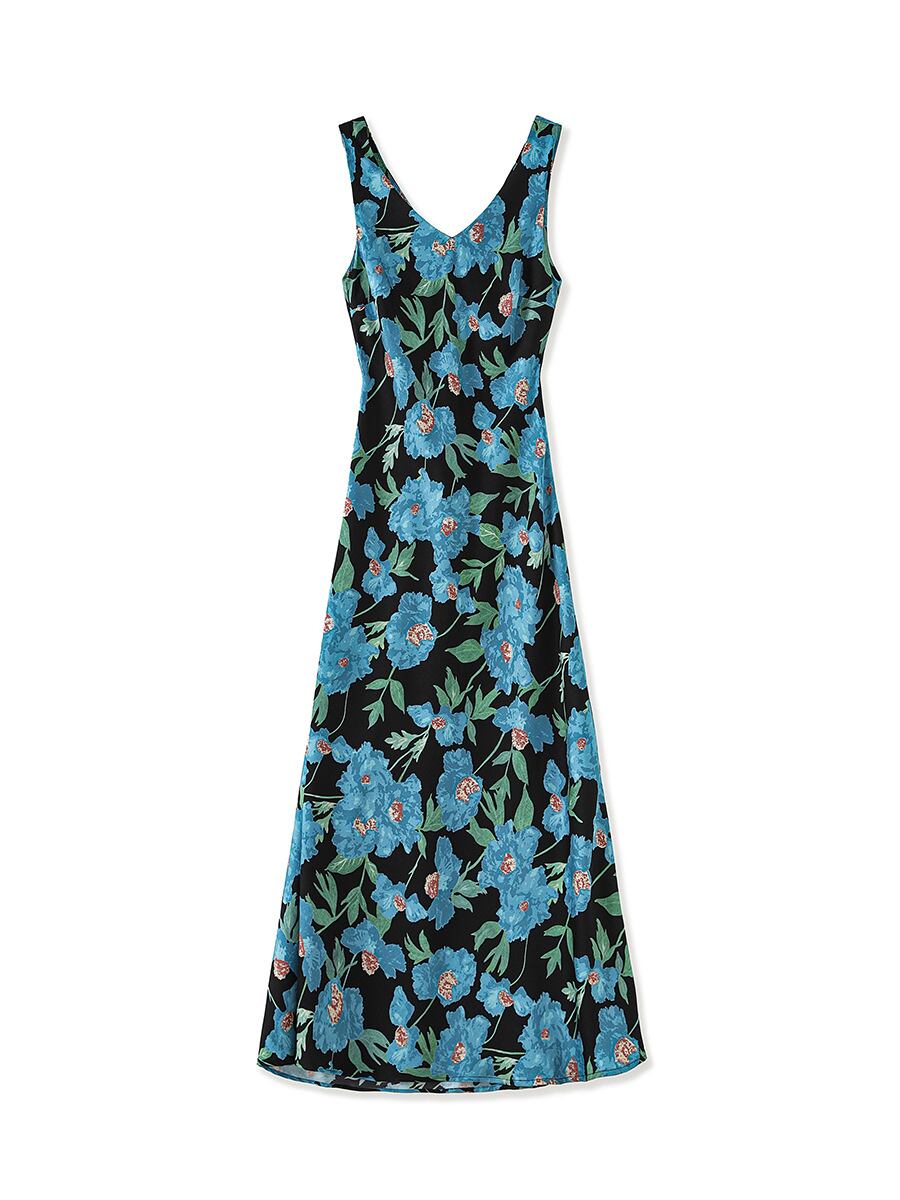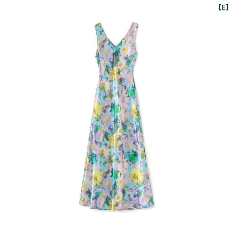 ワンピース レディース フレンチ 小花柄 ボタニカル柄 アセテートサテン ロング丈 キャミソール Vネック ノースリーブ ウエストマーク リゾート 上品 エレガント レトロ クラシック 春夏