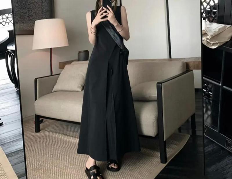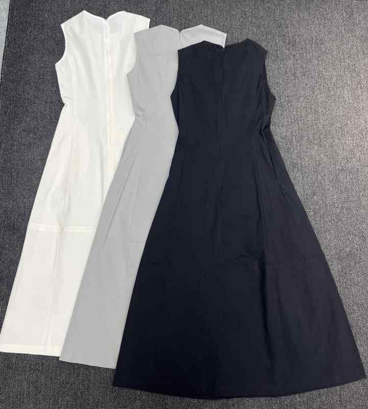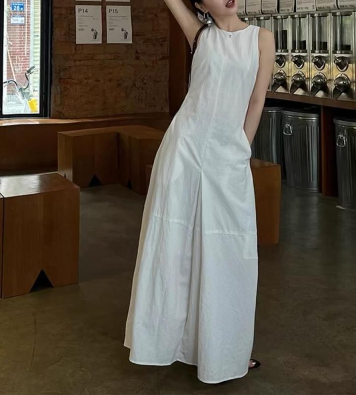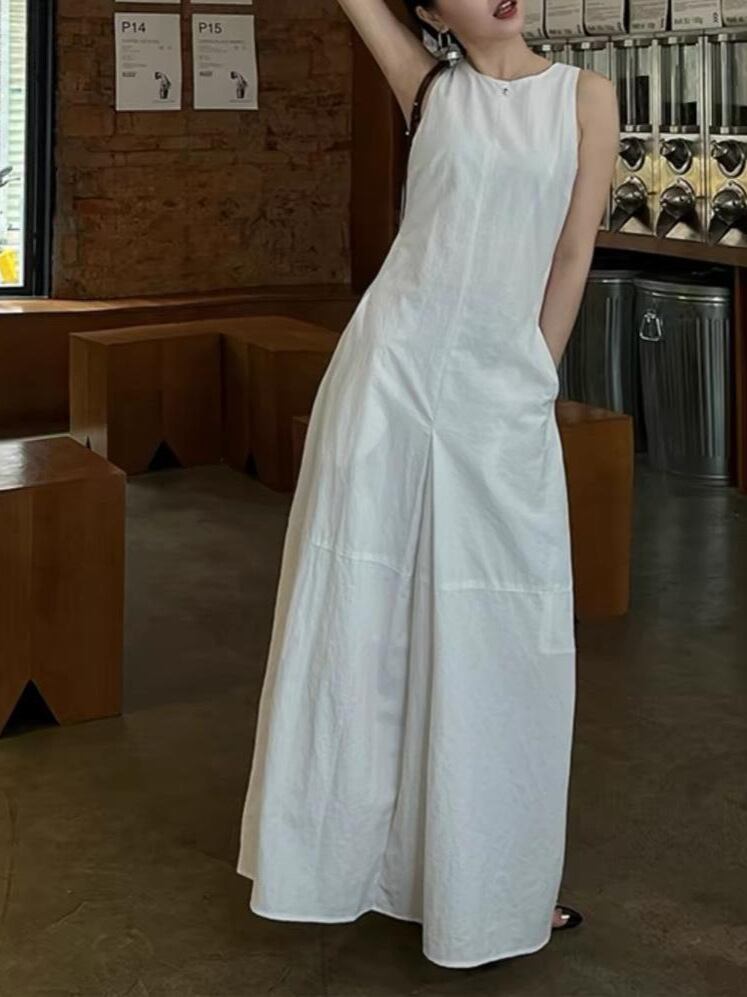 ワンピース レディース 春夏 Aライン ロング丈 ノースリーブ コットン Uネック ウエストマーク 着痩せ効果 ゆったり シンプル ミニマル きれいめ 上品 通勤 オフィス 普段使い