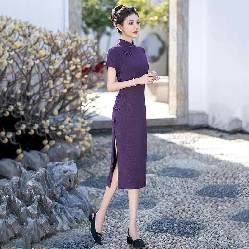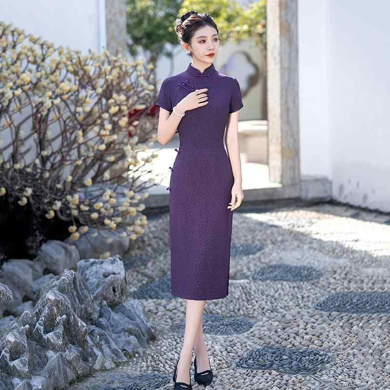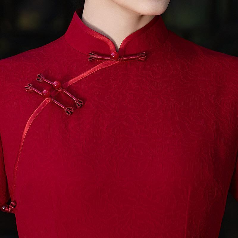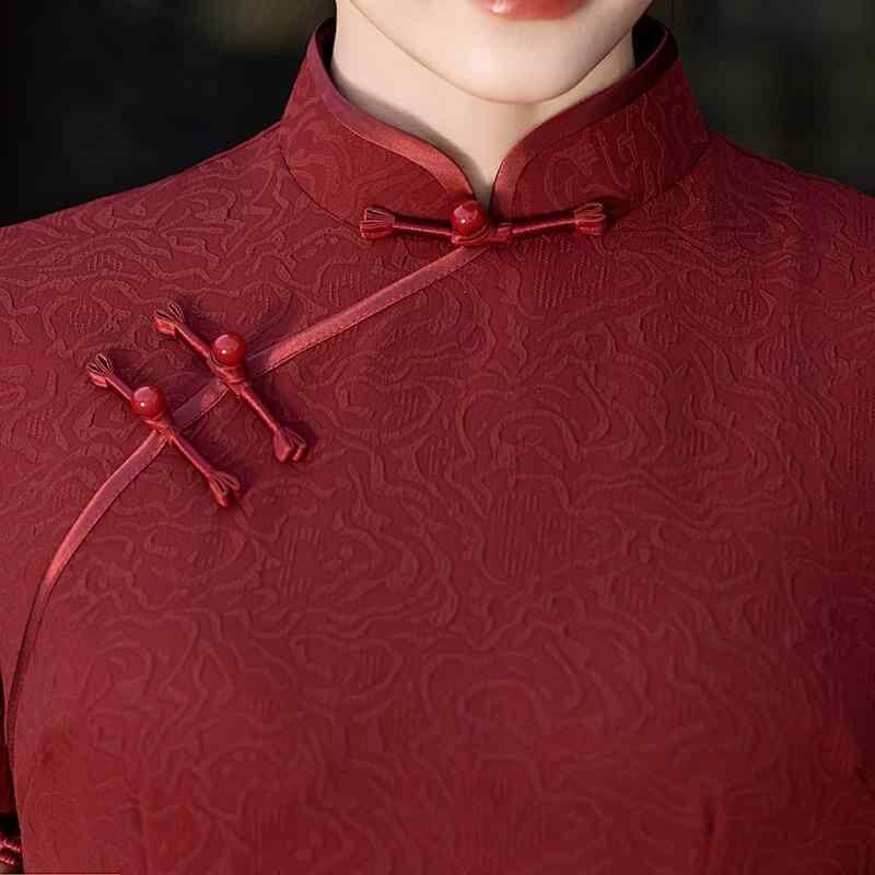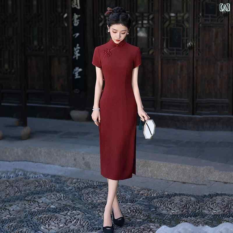 チャイナドレス レディース 中国風 暗赤色 ママ 服 中華風 レトロ スリム 半袖 夏 ミドル丈 ロング丈
