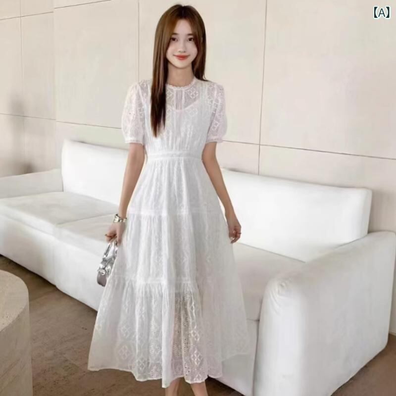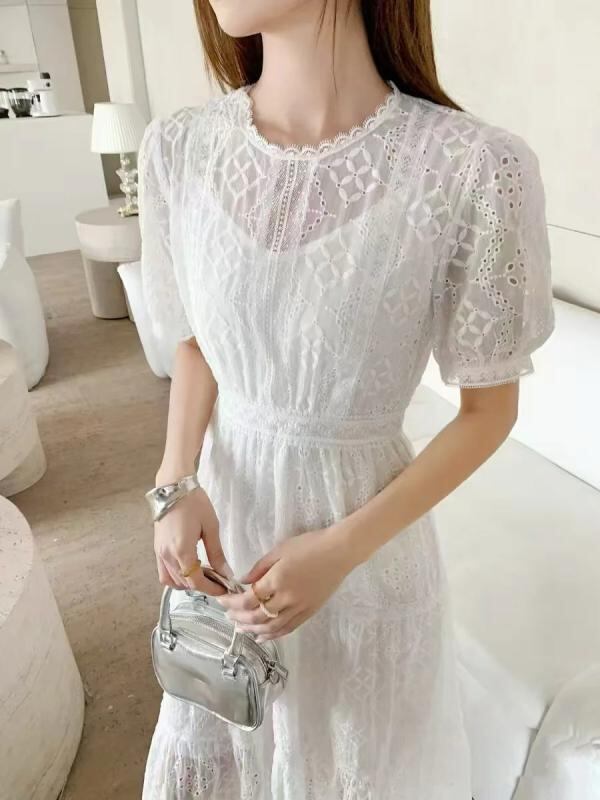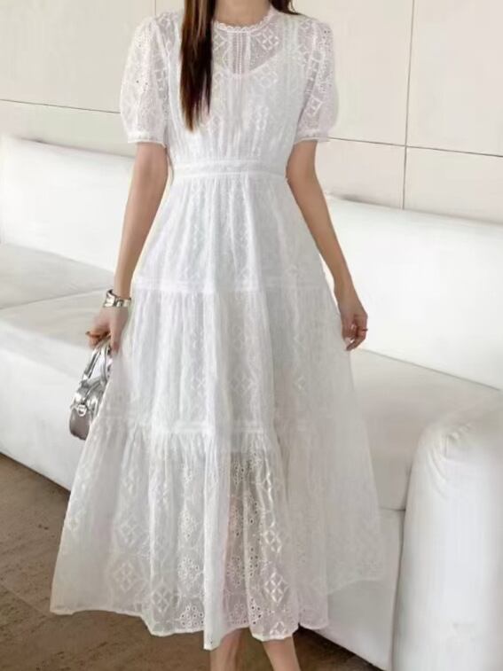 ワンピース レディース フレンチスタイル チュール レース 刺繍 Aライン ミディ丈 半袖 パフスリーブ ラウンドネック リゾートドレス エレガント フェミニン 春夏 ポリエステル