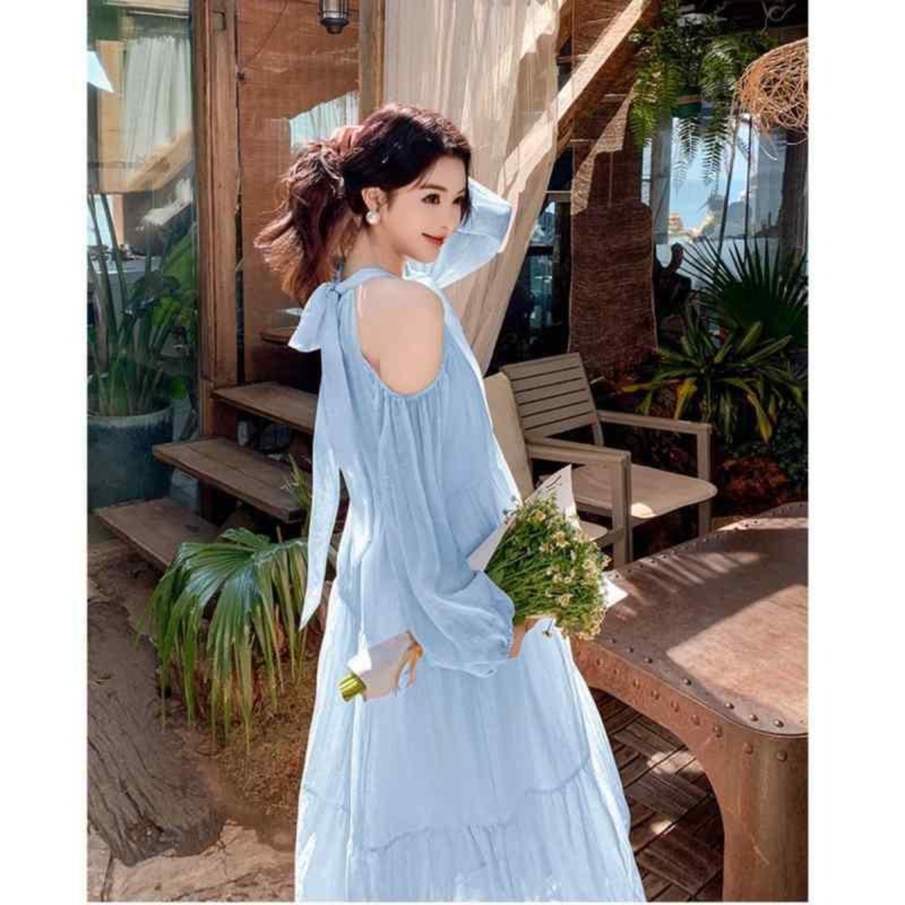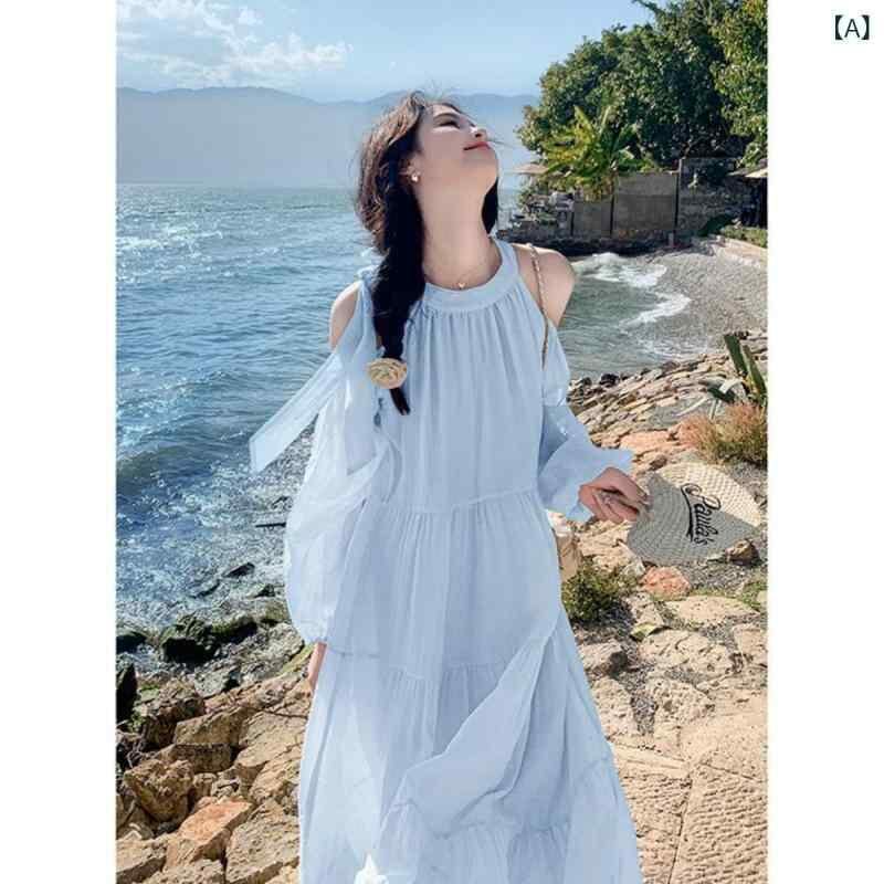 ワンピース レディース 肩出し ビーチワンピース チュニック ロングワンピース 膝下丈 ポリエステル ラウンドネック 長袖 ゆったり ギャザー Aライン フレア 天ブルー