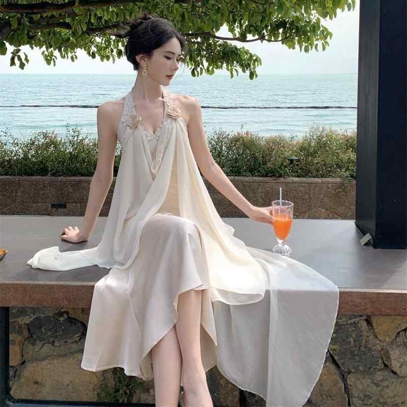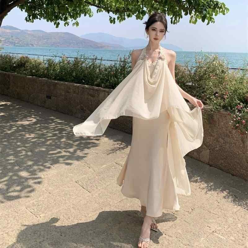 ワンピース レディース 膝丈 Aライン 高見え ポリエステル シフォン 吊りスカート ノースリーブ 普段使い デート パーティー 迷迭香