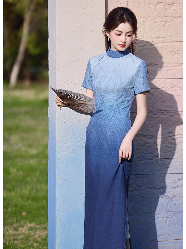 チャイナドレス レディース 若年層向け 竹繊維 グラデーションブルー 新中国風 改良 エレガント 上品 ロング丈 半袖 スタンドカラー ハイサイドスリット 普段使い 春夏 レトロモダン