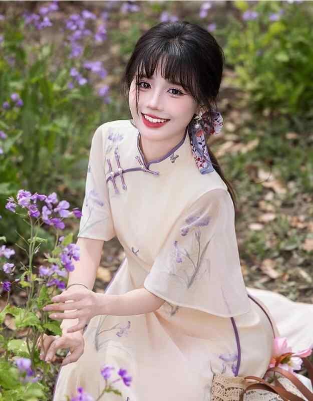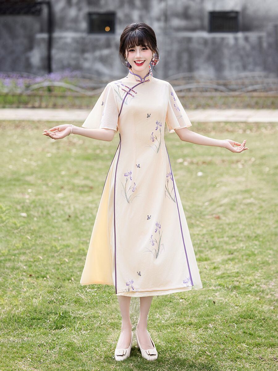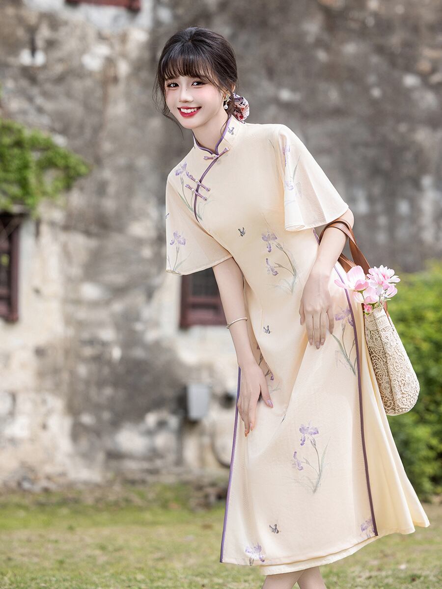ワンピース レディース 女性用 アオザイ チャイナドレス 春夏 新チャイナ風 改良型 花柄 スタンドカラー 斜め開き スリット入り ロング丈 エレガント 上品 フェミニン かわいい モダン レトロ