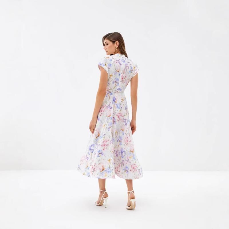 ワンピース レディース レトロ 欧米風 リゾートスタイル 花柄プリント スタンドカラー 半袖 ロング丈 Aライン 前ボタン ウエストベルト付き ポリエステル 春夏