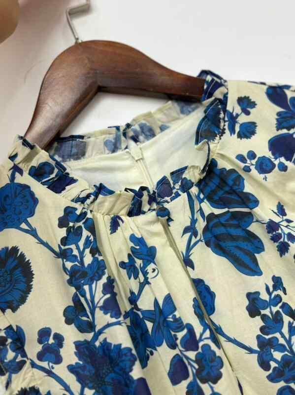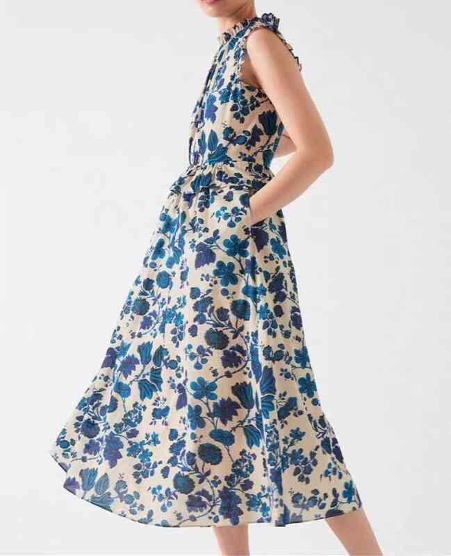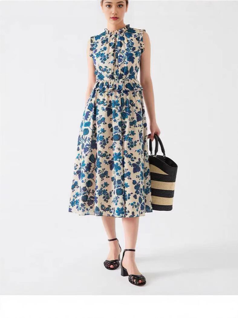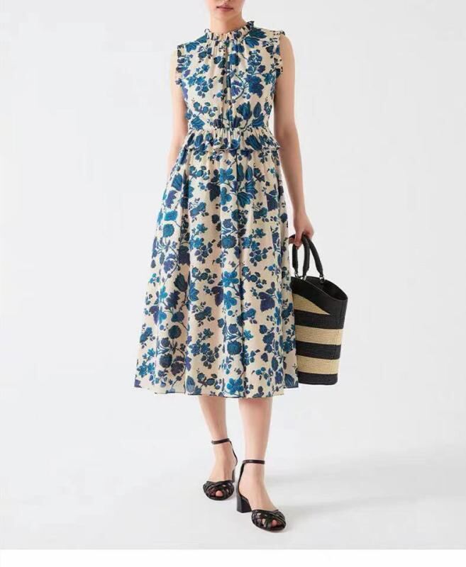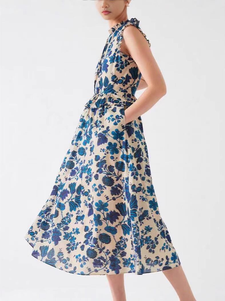 ワンピース レディース ブルー スタンドカラー ノースリーブ フリル Aライン ロング丈 プリント柄 綿素材 きれいめ 上品 夏