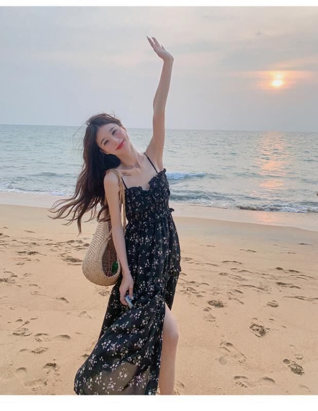 ワンピース レディース 小花柄 キャミワンピース ノースリーブ スクエアネック Aライン ハイウエスト ロング丈 ポリエステル 春夏 リゾート ビーチ バカンス 旅行 高級感 きれいめ オフィス カジュアル ブラック