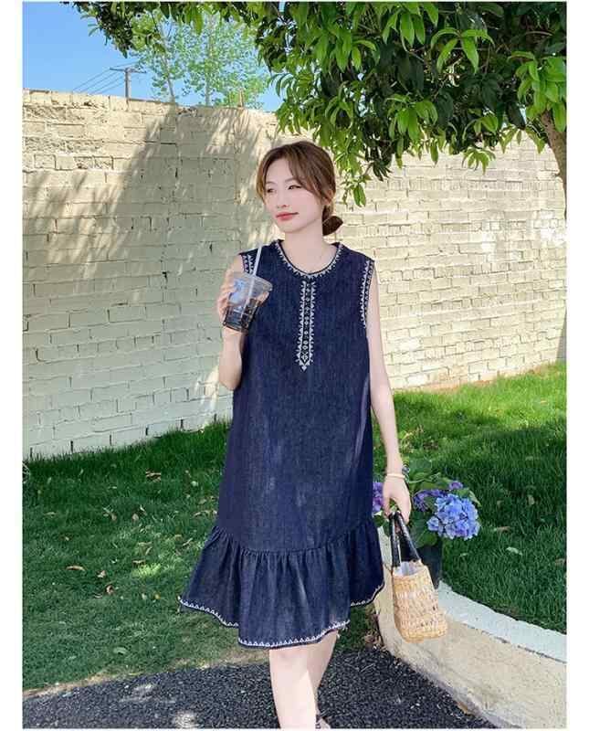 デニムワンピース レディース ノースリーブ Aライン ロング丈 ネイビー 刺繍デザイン ハイウエスト ゆったり 着痩せ 小柄 低身長 カジュアル きれいめ 通勤 春夏 ポケット付き
