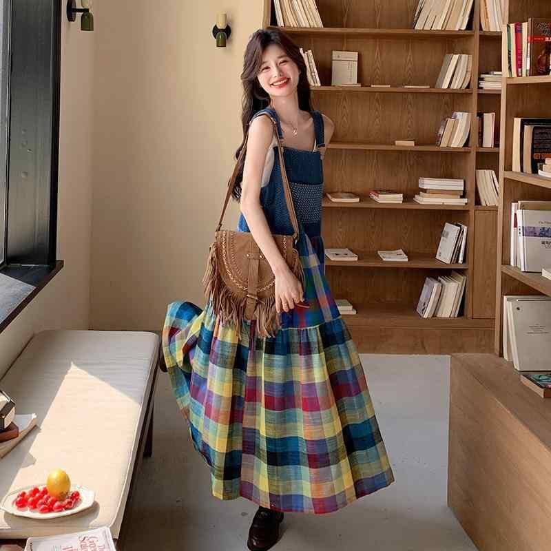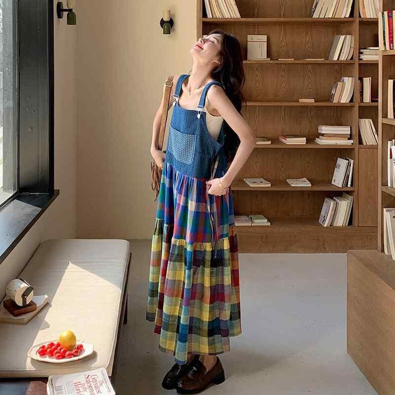 ワンピース レディース デニム サロペットスカート ジャンパースカート チェック柄 切り替え キャミワンピース ロング丈 ゆったり 夏 ノースリーブ ポリエステル カジュアル スウィート マルチカラー