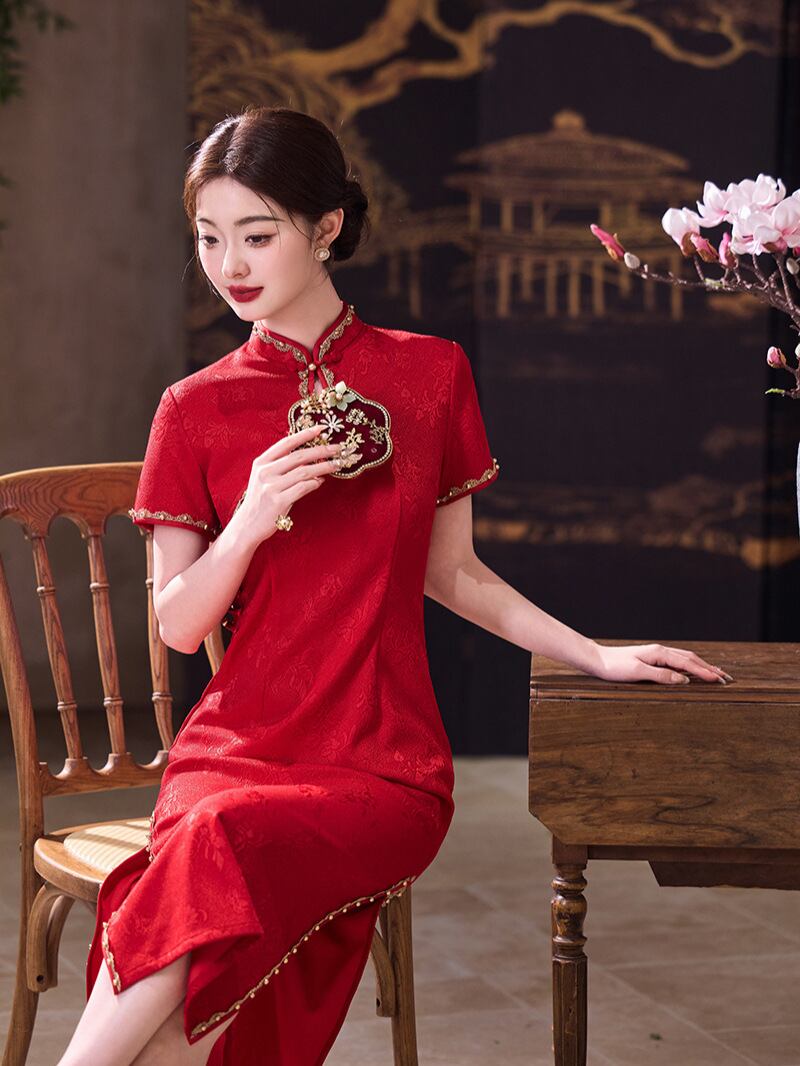 チャイナドレス レディース 春夏 中国風 ニットジャガード ポリエステル ロング丈 スタンドカラー 斜め襟 七分袖 ハイサイドスリット 改良デザイン 若者向け 単層 レッド