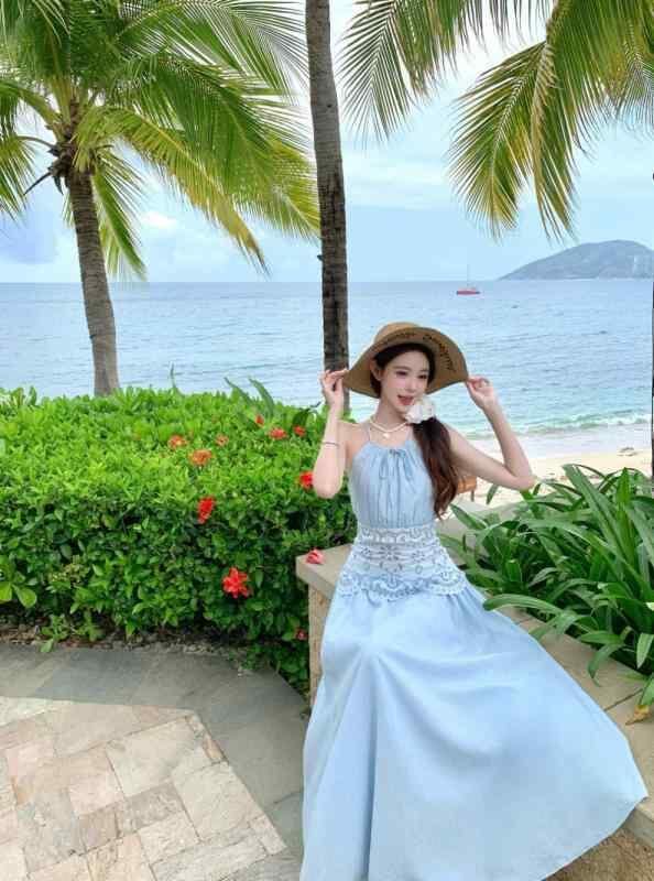 ワンピース レディース 刺繍 刺繡 Aライン ロング ハイウエスト ポリエステル 吊りスカート サマードレス リゾート 海 ビーチ 青色 ブルー