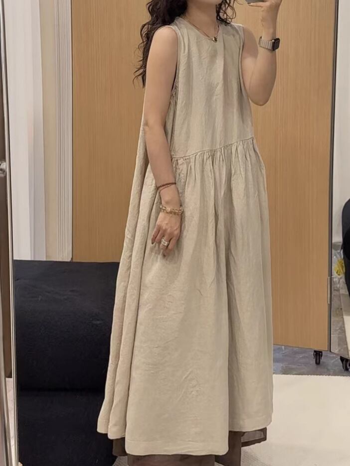 ワンピース レディース 無地 麻 リネン ラウンドネック ノースリーブ ゆったり Aライン ミディ丈 ハイウエスト カジュアル ナチュラル レトロ 春夏