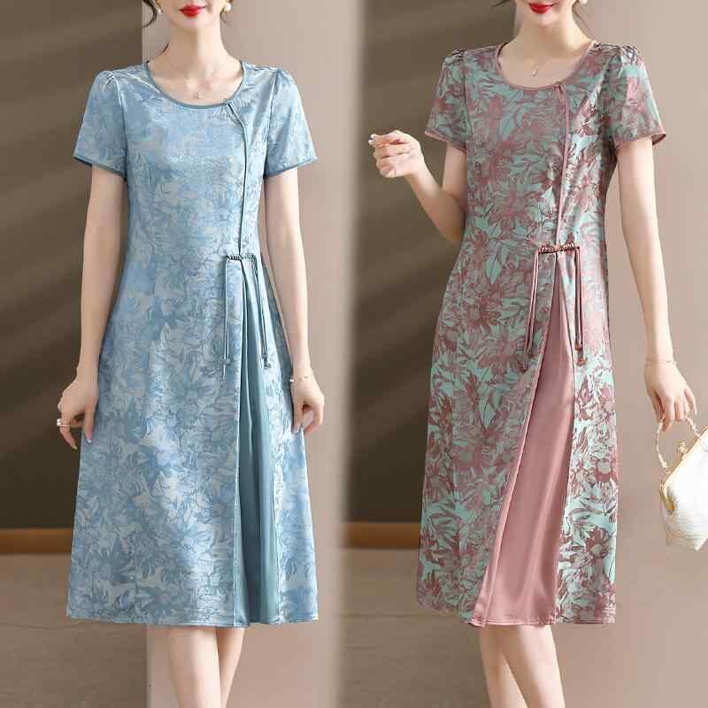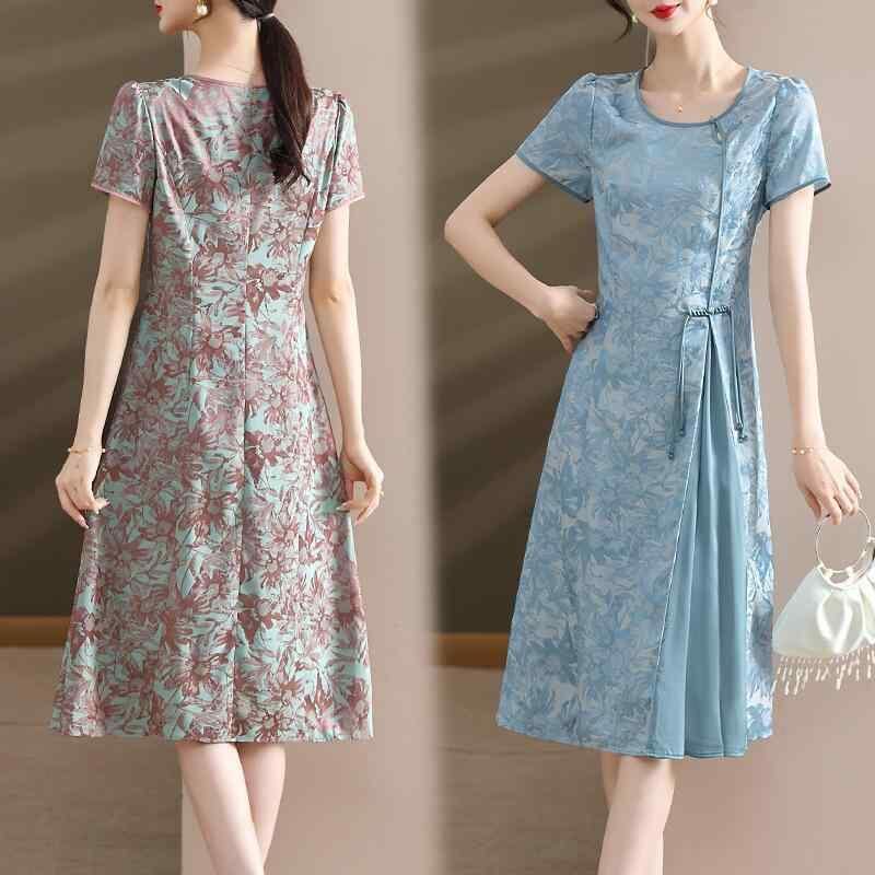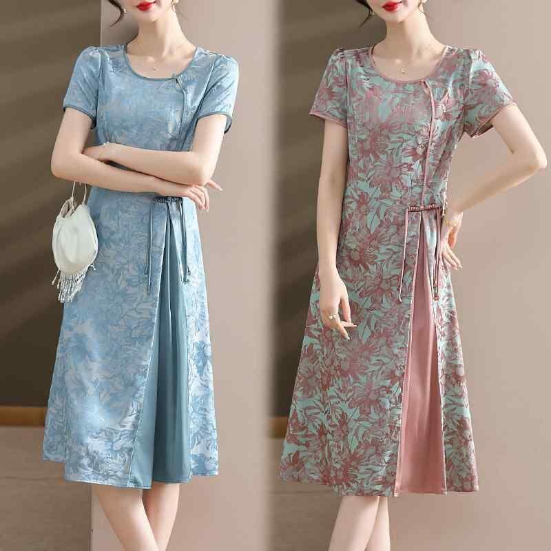 ワンピース ミセス レディース 新チャイナ風 シフォン サテン 光沢 なめらか 半袖 Aライン フレア 花柄 体型カバー リゾート ビーチ 海辺 お出かけ ドレス 夏