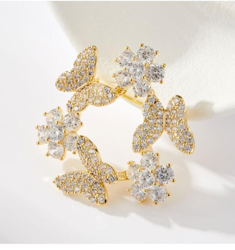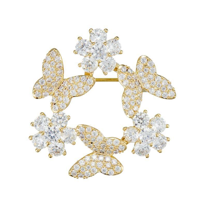 ブローチ レディース 蝶 バタフライ 花 フラワーリース ジルコニア マイクロパヴェ 輝く キラキラ 高級感 エレガント 上品 繊細 オープンワーク 透かし彫り 多用途 万能 ファッション小物 春