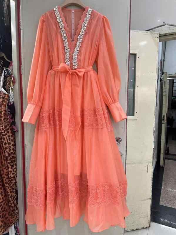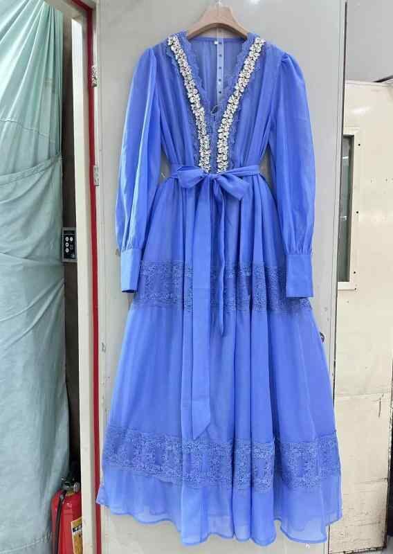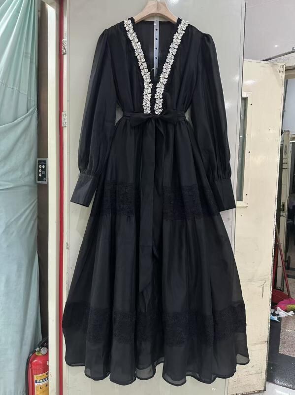 ワンピース 春夏 Vネック ロング丈 長袖 Aライン ゆったり レース ラインストーン 刺繍 切り替え ベルト付き ポリエステル 無地 プルオーバー リゾート カジュアル エレガント お出かけ