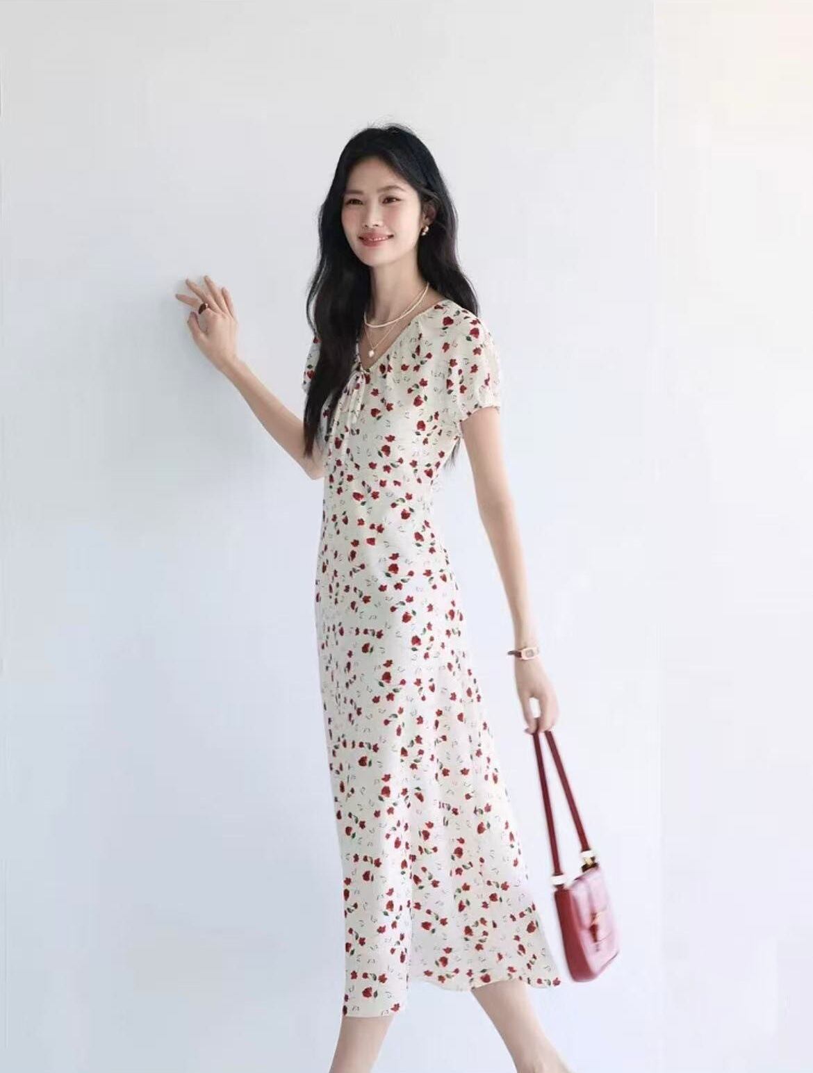 ・カテゴリ: ワンピース ・スタイル: フェミニン、スウィート ・主な素材: ポリエステル50%~70% ・加工: プリント ・スカート丈: ミディ丈 ・スカートシルエット: Aライン ・ネックライン: Vネック ・袖のタイプ: レギュラー ・袖丈: 半袖 ・ウエスト: ハイウエスト ・カラー: オフホワイト ・サイズ展開: S、M、L