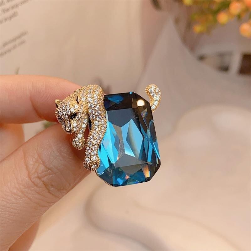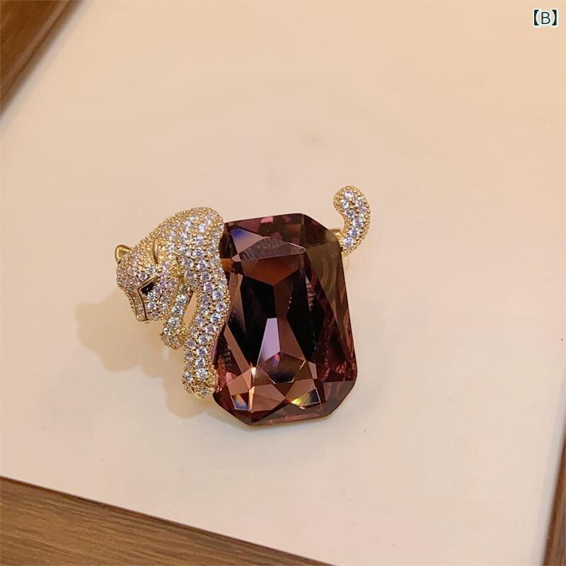 ブローチ 男女兼用 ユニセックス 銅製 オーストリアンクリスタル ヒョウ 動物モチーフ 個性的デザイン 高級感 精巧 存在感 ファッション 通勤 ブルー系 パープル系 ギフト
