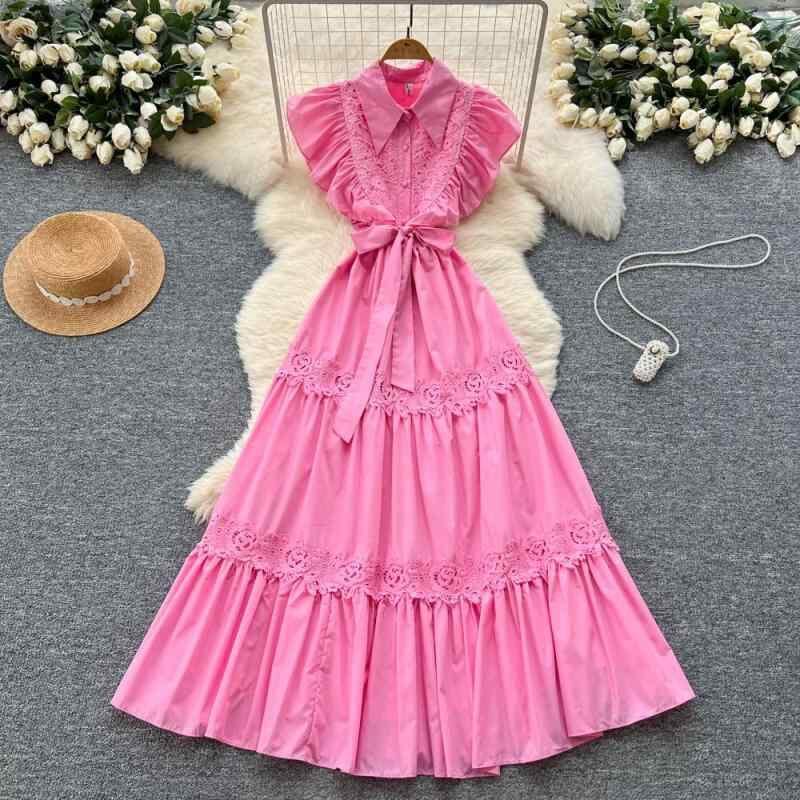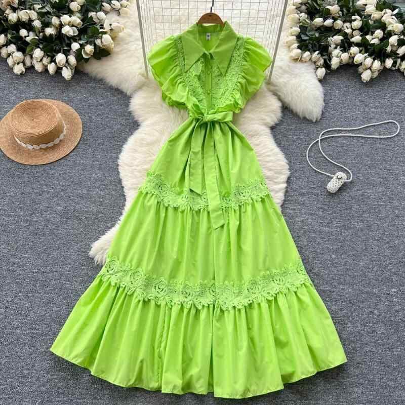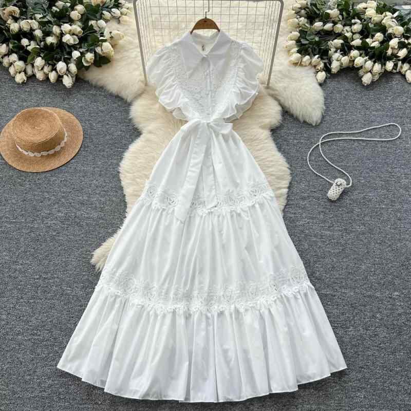 ワンピース レディース フレンチ エレガント レトロ 透かしレース 切り替え ウエストシェイプ フレンチスリーブ 細見え 上品 Aライン フレア ロング丈 ポリエステル 春夏