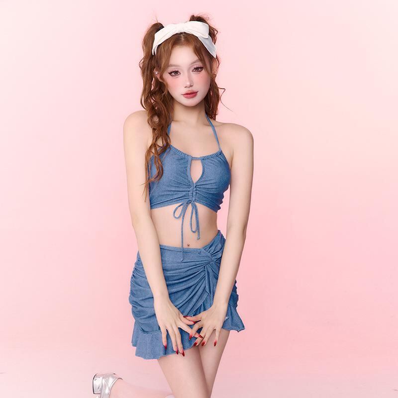 水着 レディース デニム風 セパレート 三角ビキニ セクシー トレンド 爽やか リゾートスタイル 温泉 胸パッド付き 無地 ポリエステル素材 ロイヤルブルー