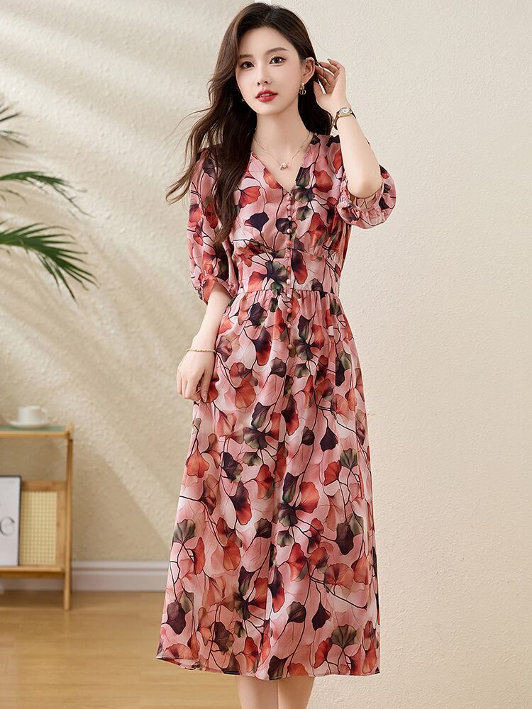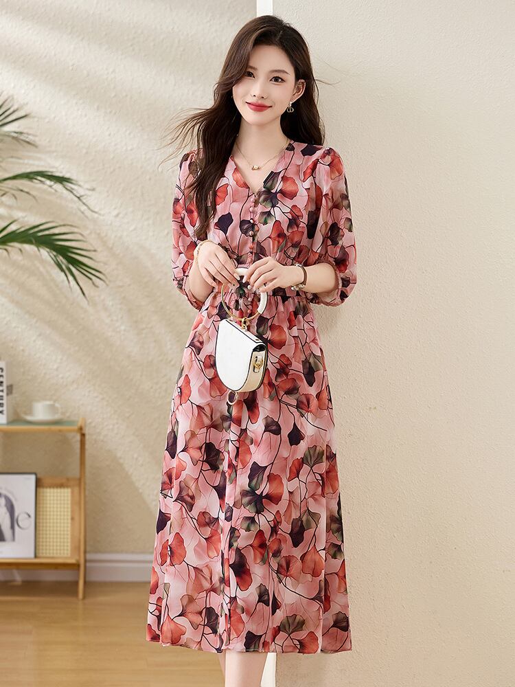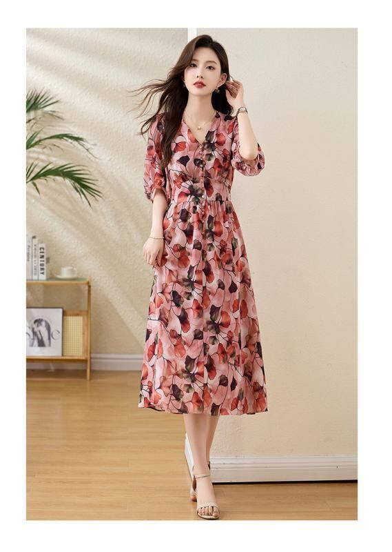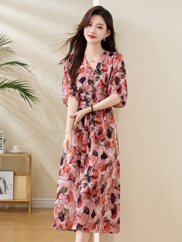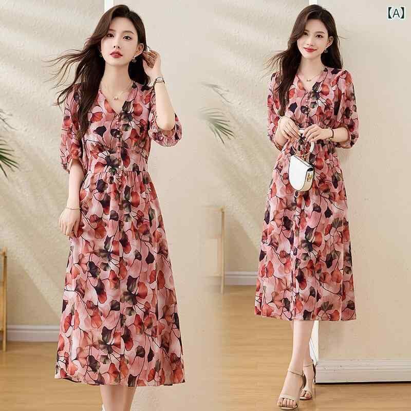 ワンピース レディース 春夏 ポリエステル ウエストマーク 小花柄 ボヘミアン Vネック 半袖 Aライン ロング丈 リゾート ビーチドレス 上品 エレガント 通勤